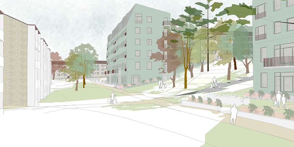 Längs med gångvägen planerar vi att placera två huskroppar med totalt 8 trapphus och 111 lägenheter. Husen planeras bli 3-4 våningar mot kvareteret Vinkelspegeln på Gräsandsvägen och 6 våningar mot gång- och cykelvägen. Samtidigt som vi bygger de nya husen ses gårdarna över kring de befintliga husen. Under de nya husen planeras ett garage med plats för cirka 55 parkeringsplatser.