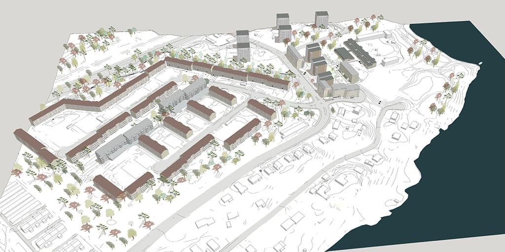 Vi vet att det finns ont om stora lägenheter i Fagersjö så med de nya bostäderna planerar vi extra många större lägenheter men även en del mindre. I det här förslaget har vi ritat på hela 97 fyror och 10 femmor. Just lägenhetsfördeleningen vet vi av erfarenhet är något som kan komma att ändras under tiden vi planerar för de nya husen.