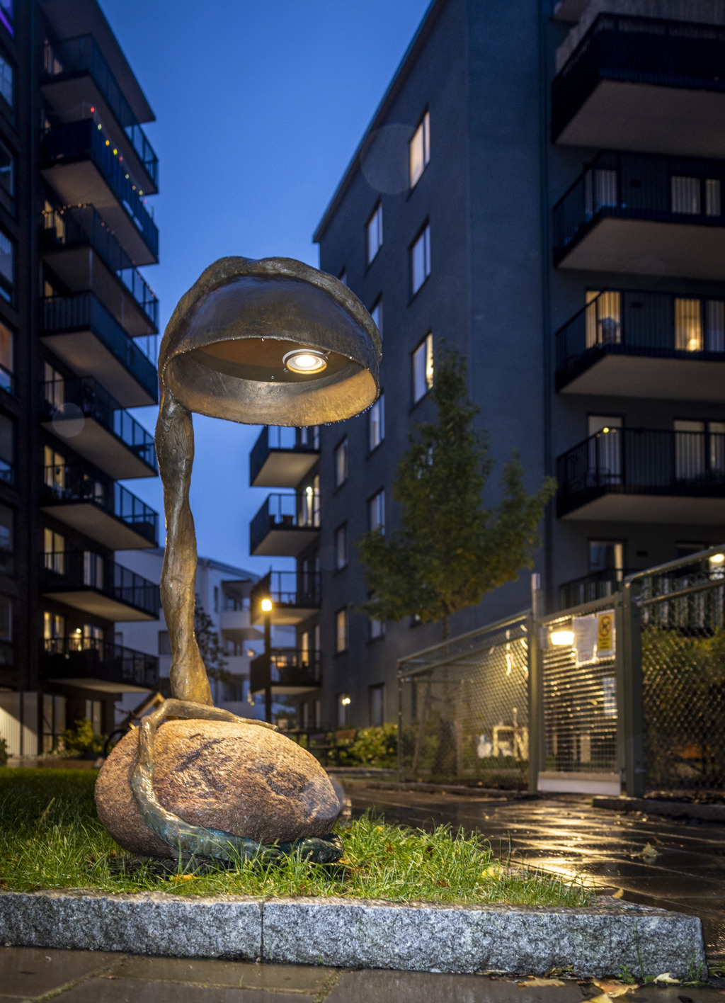 På gården finns också små överraskningar för den som tittar noga: i markplattorna syns bronsspår av skator, ekorrar, kaniner och rådjur – som om de precis tassat förbi. Husvärden berättar att barnen älskar att hoppa mellan spåren på dagarna, medan vuxna inte alltid upptäcker dem förrän man stannar upp och låter blicken vandra längs marken.